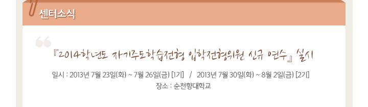 한국교육개발원 자기주도학습전형지원특임센터는 2014학년도 자기주도학습전형 입학전형위원 신규 연수를 7월 23일부터 7월 26일, 7월 30일부터 8월 2일까지