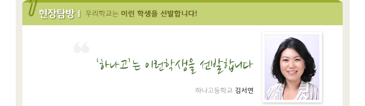 공부와 대입를 떠올리는 고등학교가 아닌, 세상을 바라보는 법과 삶을 배우는 학교 하나고에서 여러분의 멋진 꿈의 날개를 펼치시기 바랍니다.