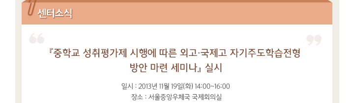 한국교육개발원 자기주도학습전형지원특임센터는 11월 19일(화) 오후 2시부터 서울중앙우체국 국제회의실에서 중학교 성취평가제 시행에 따른 외고·국제고 자기주도학습전형