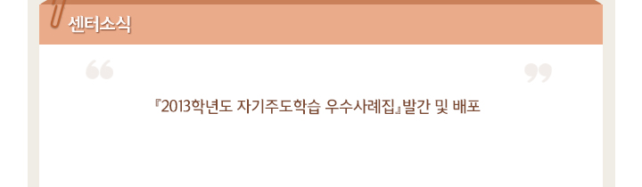 한국교육개발원 창의인성교육지원센터는 「2013학년도 자기주도학습 우수사례집」을 5월에 발간하여 배포한다.