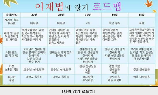 나는 교사가 되고 싶다는 생각은 있었지만 교사가 되기 위해 지금 이 순간 무엇을 어떻게 해야 하는지 몰랐다. 이와 같은 어려움 속에서 진로선생님께서는 진로 포트폴리오를 만들어보라는 조언을 해 주셨다. 진로 포트폴리오는 지금까지 나의 삶을 토대로 내 인생 장기 로드맵, 단기 로드맵, 동아리활동 등 나를 드러낼 수 있는 모든 것을 모아 둔 일종의 종합장부라고 보면 된다. 실제로 정리해보니 어지러웠던 머리도 정리가 되고 내가 활동했던 모든 활동들이 한 눈에 들어왔다. 첫 장에는 ‘나에게는 꿈이 있습니다. 역사교사가 되어 아이들을 가르치고 아이들과 함께 성장해 나가고 싶은 것, 그것이 나의 꿈입니다.’라는 마법의 문장을 써 넣고 힘들 때마다 그 문장을 읽으면서 힘을 얻을 수 있었다. 또한 포트폴리오는 나의 다짐들을 다시 한 번 마음속에 새겨 넣으면서 나의 꿈에 한걸음씩 다가갈 수 있도록 도와주는 소중한 재산이 되었다.